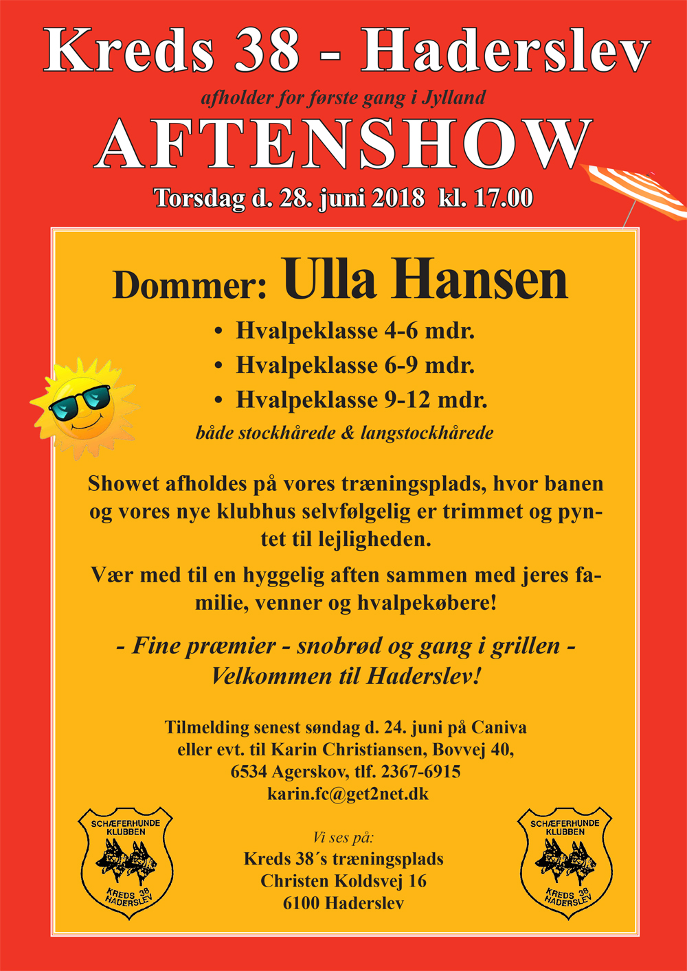Aftenhvalpeshow i kreds 38 - Haderslev, torsdag d. 28. juni kl. 17 på træningspladsen, Christen Koldsvej 16, 6100 Haderslev. Dommer: Ulla Hansen